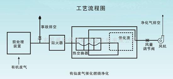经温度检测系统检测后,符合催化反应的温度要求,才可以进入催化燃烧室。反应过程使得有机废气被彻底分解,同时释放出大量的热量;净化后的气体通过热交换器将热能转换给冷气流,洁净气体由引风机排空。